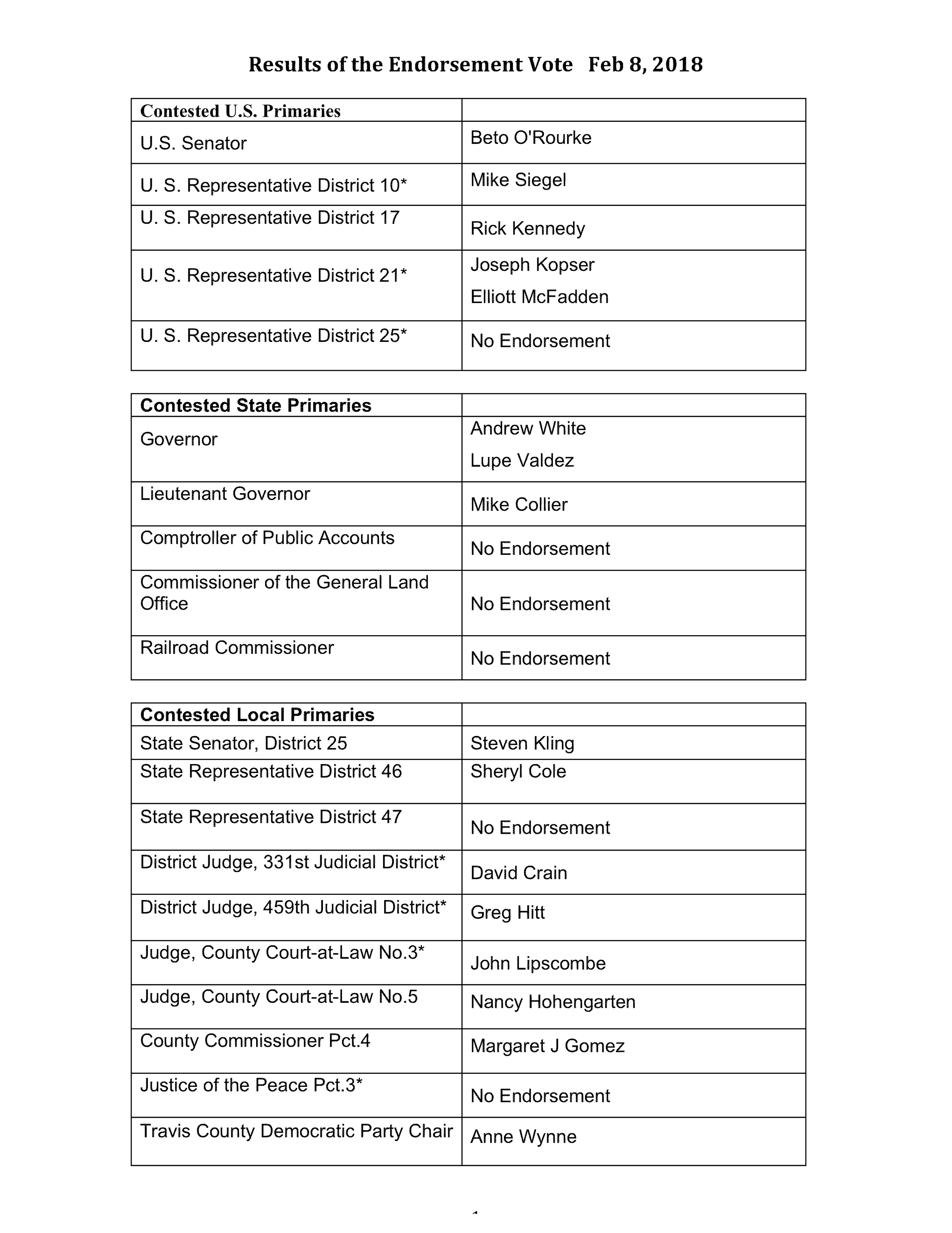 Endorsement Results From The Vote Feb. 5