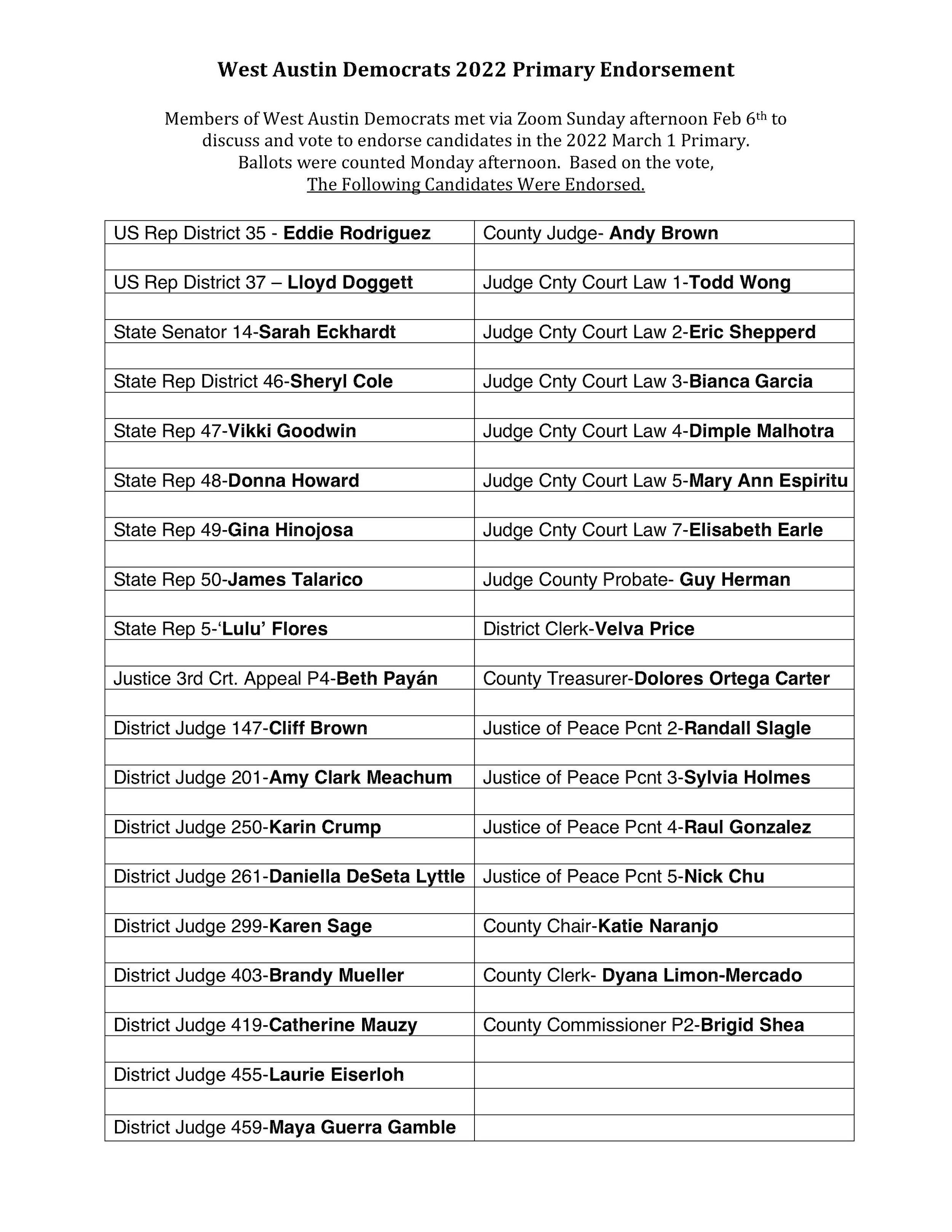 West Austin Democrats 2022 Primary Endorsement